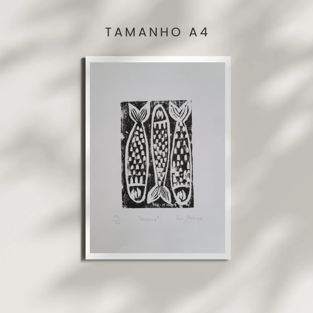 Obra título "Peixaria". Gravura feita a partir de matriz esculpida, impressa com tinta Offfset, em papel 210mm. x 297mm. Proporções média da arte impressa 105mm x 150mm